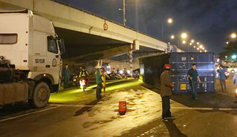 | Xe đầu kéo quay đầu vướng vào cầu vượt Linh Xuân (Thủ Đức) khiến container rơi xuống đường. |