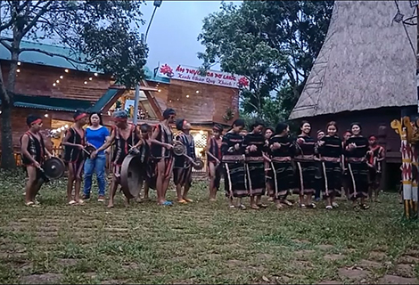 Đúng là mới bước qua cổng làng OP, tôi bị hút ngay vào không khí các bạn trẻ đang tập văn nghệ ở nhà rông, nhộn nhịp cùng những điệu múa. Tôi được anh Vinh, một người trong bộ phận quản lý, tổ chức hoạt động nhà rông của làng OP, tiếp đón. Anh cũng đang bận cùng một số người dựng cây nêu ở sân chuẩn bị buổi diễn tập cho một chương trinh làm phim, trong buổi lễ hội cồng chiêng. Thấy tôi ngắm cây nêu cao vút, với cảm giác thú vị, bởi trên đỉnh cao 20m còn gắn biểu tượng mặt trời được tô điểm sắc vàng óng. Bên cạnh đó còn có một con chim gỗ dang cánh bay nghiêng nghiêng trong gió.