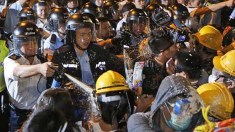 | Cảnh sát Hong Kong (Trung Quốc) phun hơi cay vào người biểu tình, tối 30/11. (Ảnh: AP) |