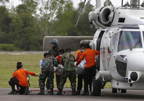 | Trực thăng của lực lượng phòng vệ biển Nhật Bản trở một thi thể nạn nhân QZ8501 được tìm thấy trên biển Java về căn cứ không quân tại Pangkalan Bun. |