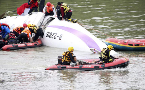 | Lực lượng cứu hộ trục vớt một thi thể hành khách từ đống đổ nát của chiếc máy bay ATR 72-600 của hãng TransAsia Airway, sau khi nó rơi xuống sông ở Đài Bắc ngày 4/2/2015. |
