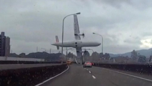 | Hình ảnh chụp từ đoạn video được một tài xế quay lại cho thấy chiếc máy bay đã nghiêng một góc 90 khi rơi xuống. Đây là tai nạn thứ 2 của hãng TransAsia Airway trong 7 tháng qua, trước đó hồi tháng 7/2014 một chiếc ATR 72-600 khác đã rơi khi gặp bão lớn tại đảo Bành Hồ, làm 48 người thiệt mạng. |