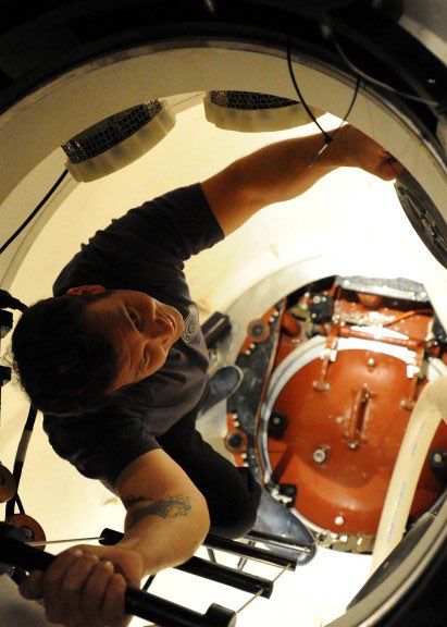 | Một thủy thủ Mỹ đang di chuyển giữa các ống phóng tên lửa chiến lược trên tàu ngầm. Sống trong cỗ máy này anh phải chấp nhận không có ánh sáng mặt trời, thời gian khá dài. |