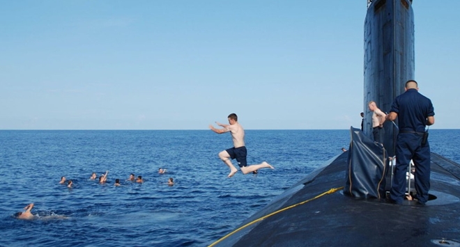 | Sau vài tháng dưới biển sâu, đôi khi các thủy thủ được thư gian để tắm nắng (bổ sung vitamin D) . Một tấm lưới cũng được căng ra quanh tàu thành bể bơi cho các thủy thủ. |