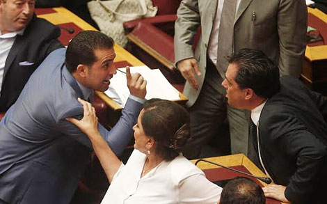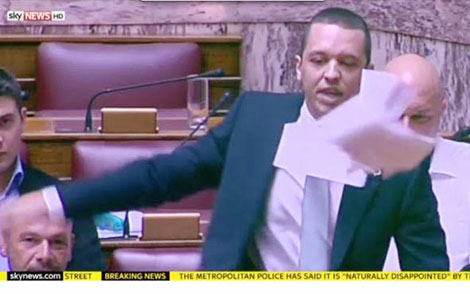 Nhưng khung cảnh hỗn loạn đã xuất hiện, khi nghị sĩ đảng Bình Minh vàng, Ilias Kasidiaris xé tan bản dự thảo luật đặt trên bàn trong sự giận giữ và tung những mảnh giấy vụn bay tứ tung trước mặt các nghị sĩ quốc hội.