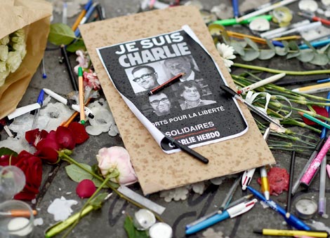 | Bút và hoa để tưởng niệm các nạn nhân vụ khủng bố tấn công tòa soạn báo Charlie Hebdo. |