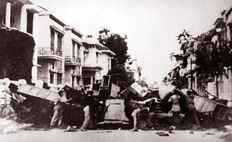 | Nhân dân Hà Nội dùng đồ đạc, tài sản dựng chiến lũy trên đường, cản bước xe tăng địch. |