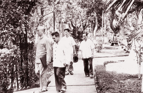 | Đồng chí Lê Đức Thọ (người đi đầu cầm cặp) vào thăm và làm việc với Bác Hồ sau khi từ chiến trường miền Nam ra, chuẩn bị đi Pari (người đi bên cạnh là đồng chí Vũ Kỳ). |
