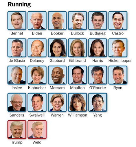 Chưa bao giờ có nhiều ứng viên tuyên bố sẽ tham gia tranh cử đến thế trong một cuộc bầu cử Tổng thống Mỹ. Tính đến lúc này, đã có 23 ứng viên của đảng Dân chủ tuyên bố tham gia đường đua (và con số đó được cho là vẫn chưa dừng lại).