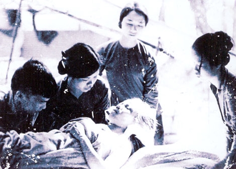 | Bác sĩ Trương Xuân Liễu (thứ hai từ trái qua) cấp cứu bệnh nhân ở Bệnh viện Liên cơ Tân Biên - Tây Ninh năm 1974. |