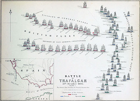 Ngày 21-10-1805, 27 chiến hạm dưới quyền chỉ huy của Horatio Nelson - người đứng ở soái hạm HMS Victory - lao thẳng vào tấn công 33 chiến hạm của liên quân Pháp - Tây Ban Nha đang dàn trận phòng ngự quang mũi Trafalgar (nằm ở phía Tây Bắc eo biển Gilbraltar nối liền Địa Trung Hải và Đại Tây Dương).