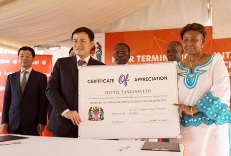 | Lãnh đạo Tập đoàn Viettel nhận Bằng tri ân về việc thực thi nghiêm túc những cam kết với Chính phủ Tanzania. |