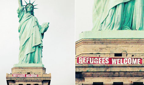 | Ngày 21-2-2017, một băng-rôn với hàng chữ “Đón chào người tị nạn” đã được treo ở tượng Nữ thần Tự do để phản đối chính sách nhập cư của Tổng thống Trump. |
