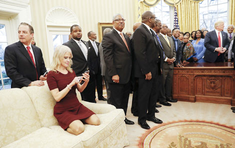 | Kellyanne Conway mang giày quỳ lên sofa trong Phòng Bầu Dục - một hình ảnh không đẹp xuất hiện ở nước Mỹ thời Tổng thống Trump. |