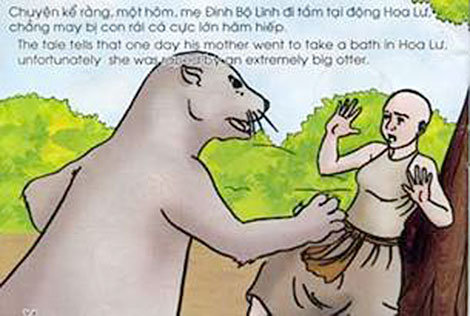 | Tranh vẽ lại Huyền thoại Đinh Bộ Lĩnh là con trai của rái cá. Nguồn: "Thuở thiếu thời hàn vi của Đinh Bộ Lĩnh" (Nxb Giáo dục, 2008). |
