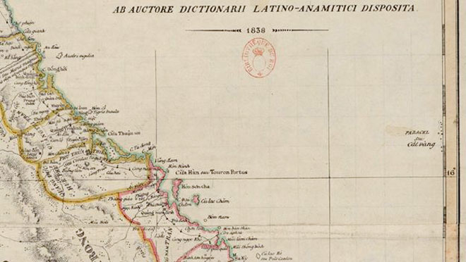 | PARACEL seu Cát Vàng, trích “An Nam đại quốc họa đồ”, 1838, Tabert. 84x45 cm. Nguồn: Courtesy Olin Library Map Collection, Cornell University, G8005 1838. T3. |