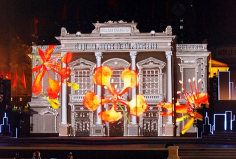 | Hình ảnh Nhà hát lớn Hải Phòng với biểu tượng hoa phượng 3D tối 6/5/2016. |