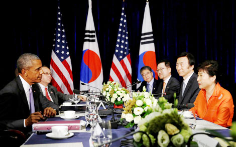 | Tổng thống Hàn Quốc Park Geun-hye trong cuộc họp song phương với Mỹ bên lề Hội nghị thượng đỉnh ASEAN tại Vientiane (Lào) ngày 6-9-2016. |