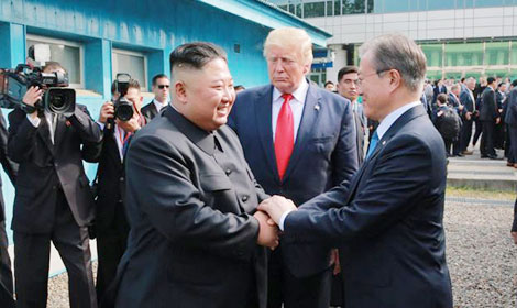 | Chủ tịch Triều Tiên Kim Jong-un gặp Tổng thống Hàn Quốc Moon Jae-in và Tổng thống Mỹ Donald Trump ở phía Nam của đường phân giới quân sự phân chia Triều Tiên và Hàn Quốc. |