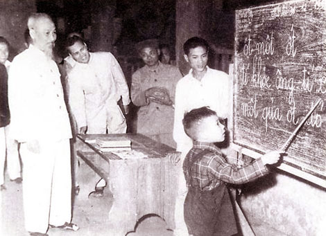 | Bác Hồ thăm lớp vỡ lòng ở Hàng Than, Hà Nội. |