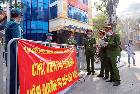 | Công an Hà Nội kiểm soát người ra vào khu cách ly tại phường Trúc Bạch. |