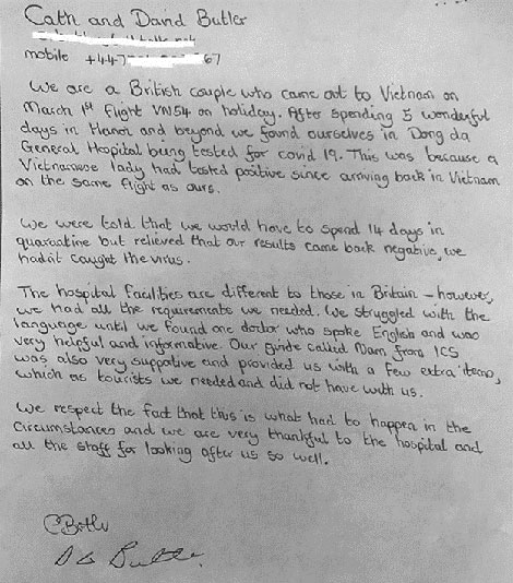Sau khi có kết quả xét nghiệm âm tính, vợ chồng bà Cath và ông David Butler (người Anh) đã gửi thư cảm ơn trong thời gian sống tại khu cách ly ở Bệnh viện Đống Đa, Hà Nội. Bức thư này đã được chị N.T.H.L., một người ở cùng khu cách ly với ông bà Butler đưa lên tài khoản Facebook và nhanh chóng được lan truyền, chia sẻ trên mạng xã hội.
