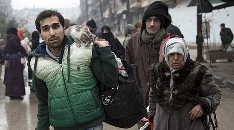 | Người dân Syria rời khỏi một khu vực bị phiến quân chiếm giữ ở Aleppo ngày 13-12. |