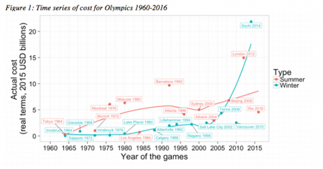 Nghiên cứu của Oxford phân tích, cả Olympic mùa hè và Olympic mùa đông, bắt đầu từ Rome 1960 (Italia) và Thế vận hội mùa đông Squaw Valley 1960, gần một nửa các kỳ Thế vận hội chi vượt quá ngân sách hơn 100%.