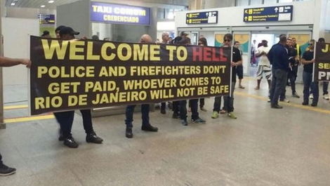 Du khách đến với sân bay quốc tế Galeao ở TP Rio De Janeiro - Brazil không khỏi sửng sốt khi nhìn thấy một số cảnh sát cầm biểu ngữ: “Chào mừng đến với địa ngục”. Hãng tin AP ngày 31/7 cho biết. Thông điệp trên được viết bằng tiếng Anh và tiếng Bồ Đào Nha: “Cảnh sát và lính cứu hỏa không được trả lương. Bất kỳ ai đến với Rio de Janeiro sẽ không được an toàn”. Hình ảnh này được lan truyền rộng rãi trên mạng xã hội và báo chí Brazil.