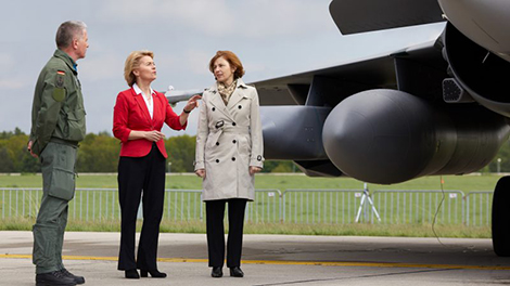 | Bộ trưởng Quốc phòng Pháp (bên phải) và Bộ trưởng Quốc phòng Đức (đứng giữa) bàn về một loại vũ khí mới. Ảnh: EurActi. |