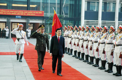Chủ tịch nước Trương Tấn Sang, Bộ trưởng Trần Đại Quang duyệt đội danh dự Công an nhân dân Việt Nam. Ảnh: V.A. |