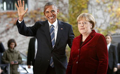 Thủ tướng Đức Angela Merkel đón Tổng thống Mỹ Barack Obama tại Berlin ngày 17-11.