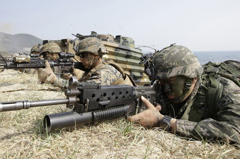 | Lính thủy quân lục chiến Hàn Quốc và Mỹ trong một cuộc tập trận chung. |