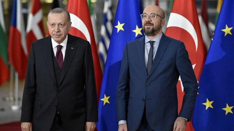 | Tổng thống Thổ Nhĩ Kỳ Recep Tayyip Erdogan và chủ tịch Hội đồng châu Âu Charles Michel tại Brussels, ngày 9-3. |