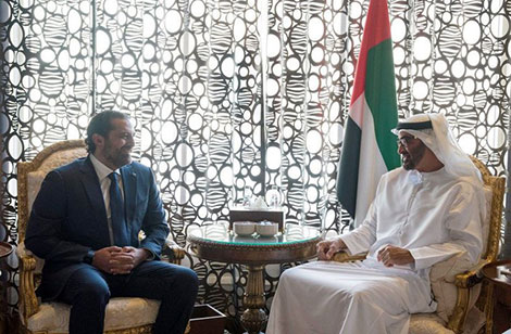 | Thủ tướng Liban Saad Hariri (bên trái) hội kiến Hoàng thái tử Abu Dhabi Sheikh Mohammed bin Zayed al-Nahyan hôm 7-11. |