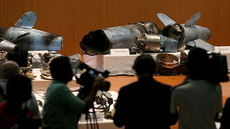 | Các mảnh vỡ tên lửa được Arab Saudi công bố trong cuộc họp báo về vụ tấn công nhằm vào hai nhà máy dầu. |