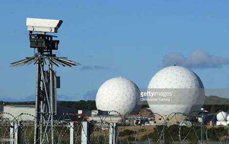 Hệ thống camera an ninh phía trên các vòm radar của căn cứ không quân Anh ở Menwith Hill tại Yorkshire miền bắc nước Anh.