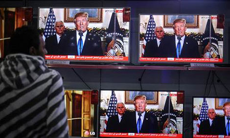 | Hình ảnh Tổng thống Mỹ phát biểu công nhận Jerusalem là thủ đô Israel phủ sóng trên các kênh truyền hình. |
