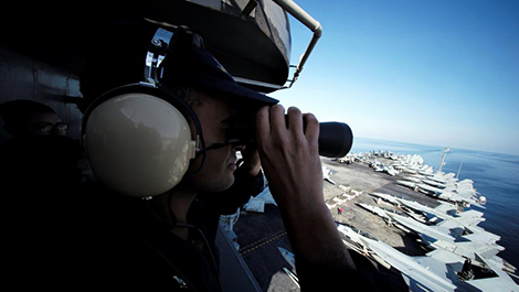 | Một thủy thủ Mỹ quan sát trên tàu USS John C. Stennis trong lúc đi qua eo biển Hormuz. |