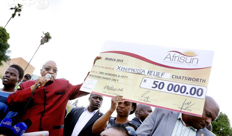 | Tổng thống Jacob Zuma và tấm ngân phiếu 50.000 rand trao cho các nạn nhân của bạo lực bài ngoại tại trại tị nạn Chatsworth. |