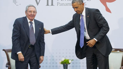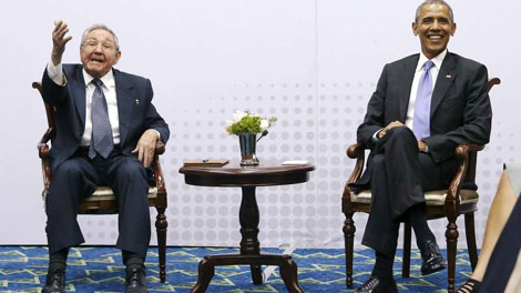 | Chủ tịch Cuba Raul Castro (trái) gặp Tổng thống Mỹ Barack Obama bên lề thượng đỉnh châu Mỹ tại Panama, ngày 11/4/2015. |
