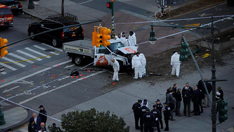 | Cảnh sát giám định chiếc xe tải nhẹ do nghi phạm thuê để tấn công khủng bố tại New York ngày 31-10. |
