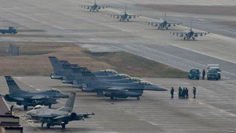 | Các máy bay chiến đấu của Mỹ được điều động tới cuộc diễn tập Vigilant Ace tại Căn cứ Không quân Osan, Hàn Quốc, ngày 3-12. |