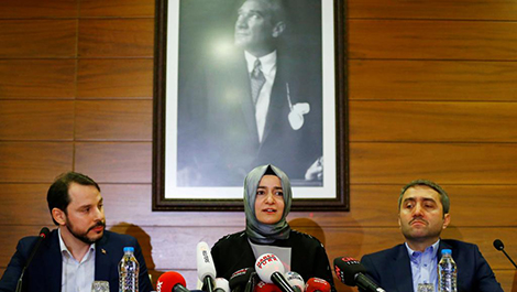 | Bộ trưởng các chính sách xã hội và Gia đình Thổ Nhĩ Kỳ Sayan Kaya (giữa) họp báo tại sân bay Istanbul sau khi bị Hà Lan trục xuất ngày 12-3-2017. |