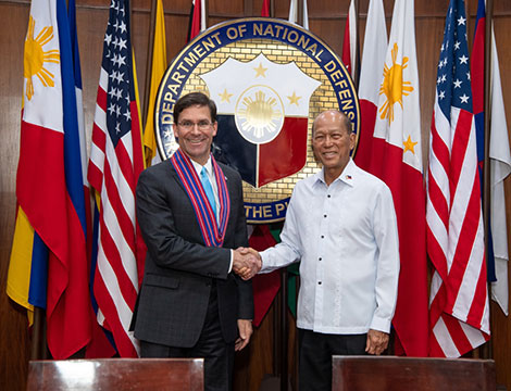 | Bộ trưởng Quốc phòng Mỹ Thomas Esper và Bộ trưởng Quốc phòng Philippines Delfin Lorenzana tại Manila, tháng 11-2019. |