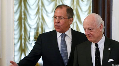 Ngoại trưởng Nga Sergei Lavrov và Đặc sứ Liên Hiệp Quốc về Syria Staffan de Mistura tại Moskva, ngày 3-5.