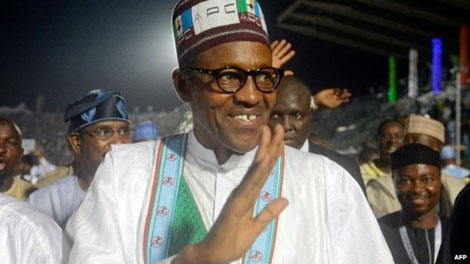| Tân Tổng thống M. Buhari vẫy chào người hâm mộ trước kết quả bầu cử. |