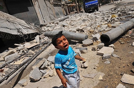 | Cậu bé bị mất cha mẹ sau trận không kích. |