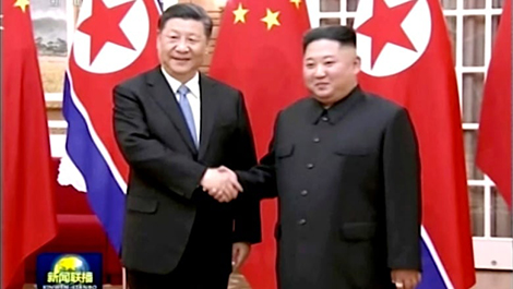 | Đài truyền hình CCTV của Trung Quốc đưa tin Chủ tịch Trung Quốc Tập Cận Bình và nhà lãnh đạo Triều Tiên Kim Jong Un bắt tay trước khi bước vào cuộc họp ở Bình Nhưỡng ngày 20-6. |
