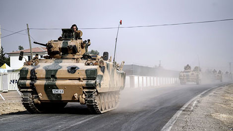 | Xe tăng quân đội Thổ Nhĩ Kỳ tiến đến biên giới Syria ngày 3-9. |